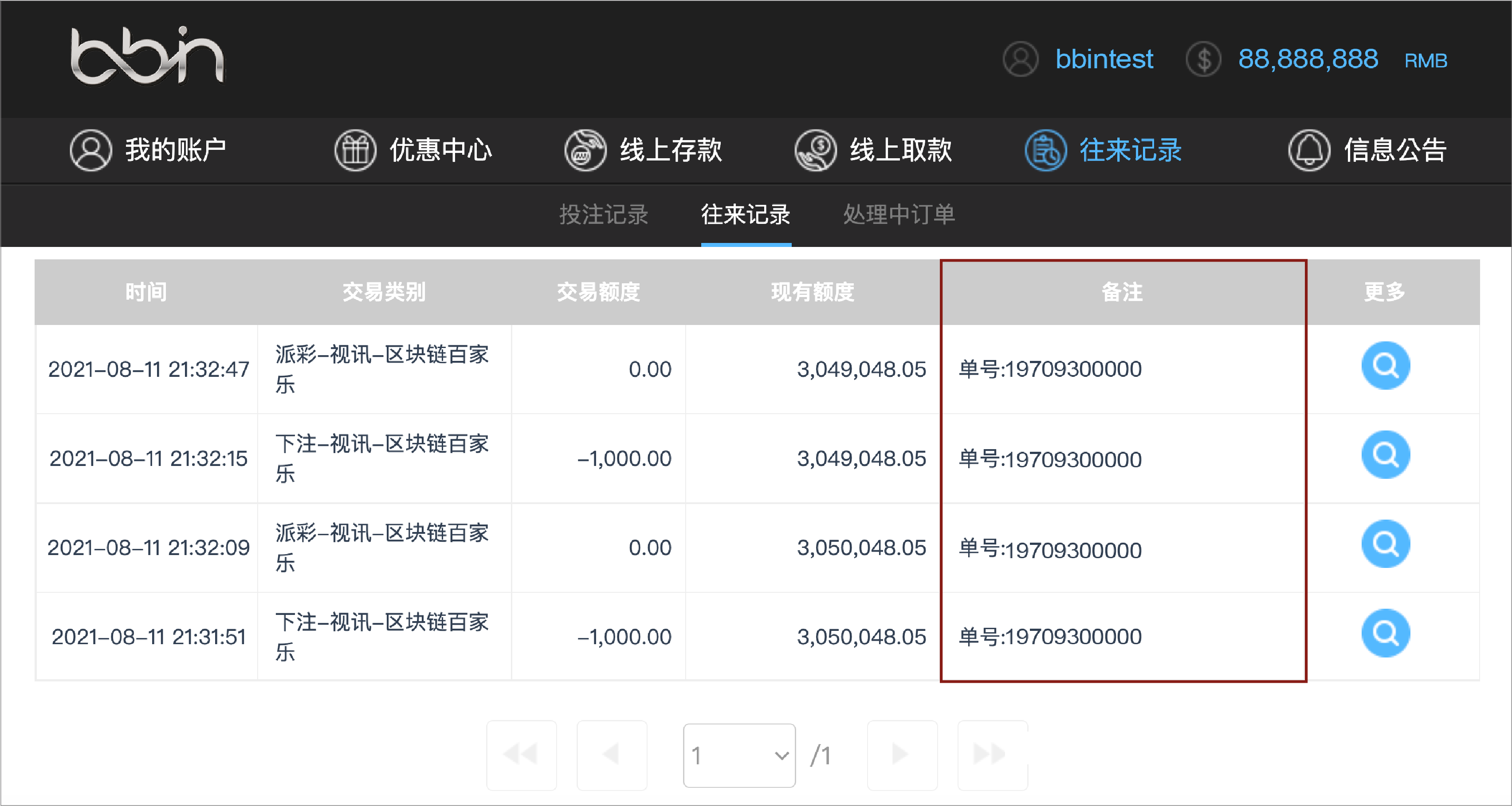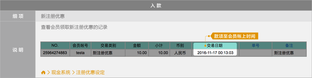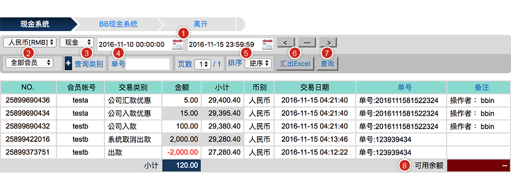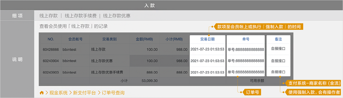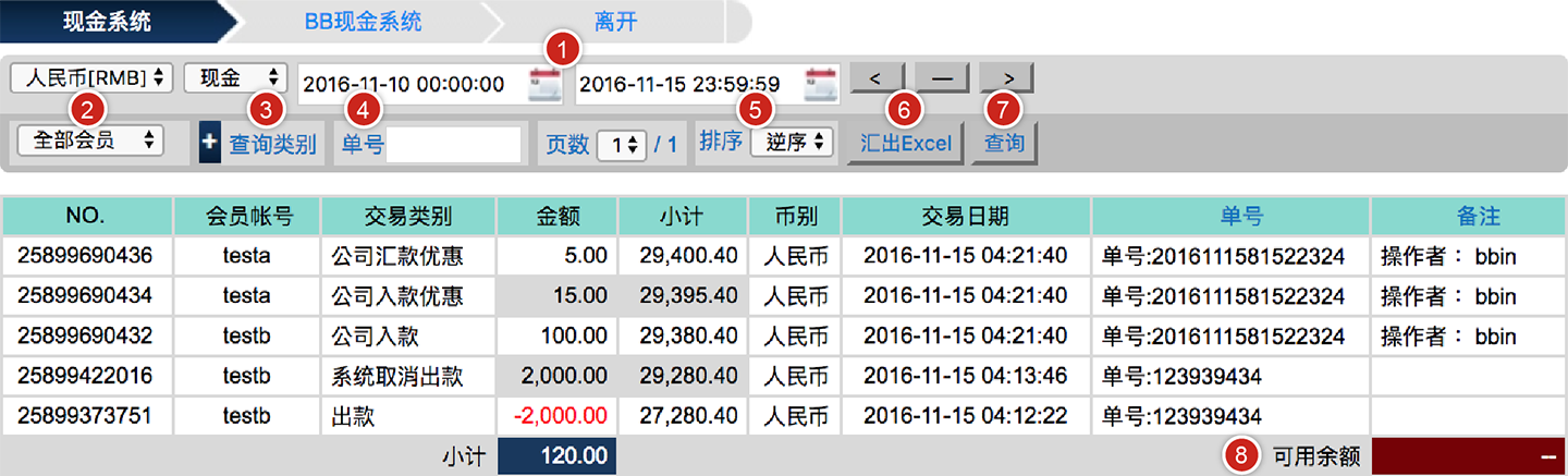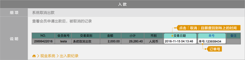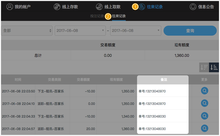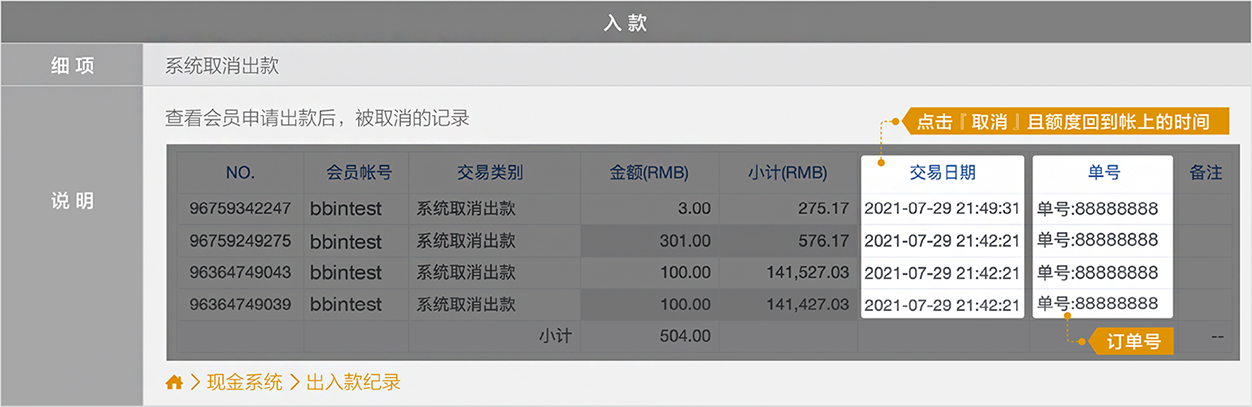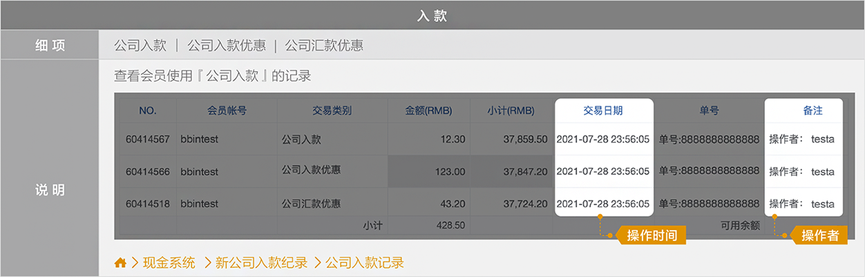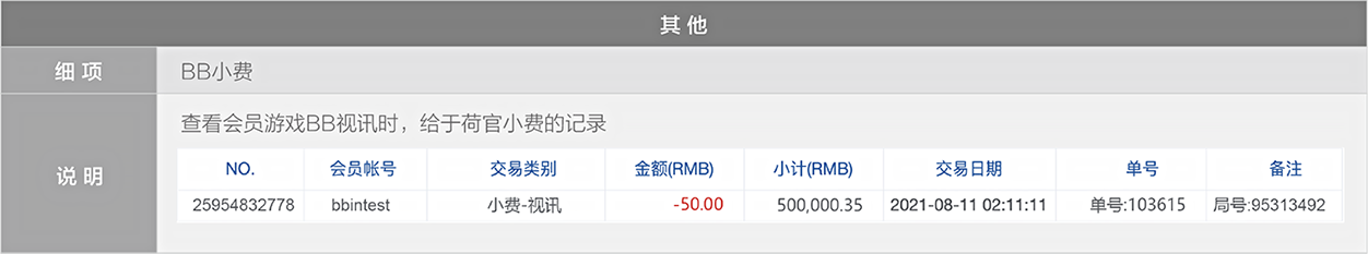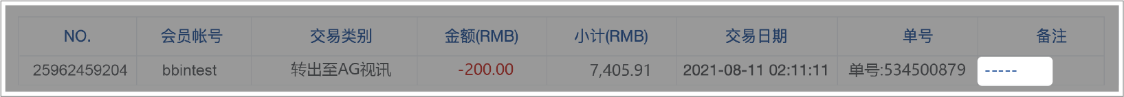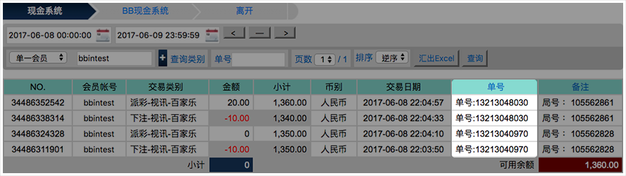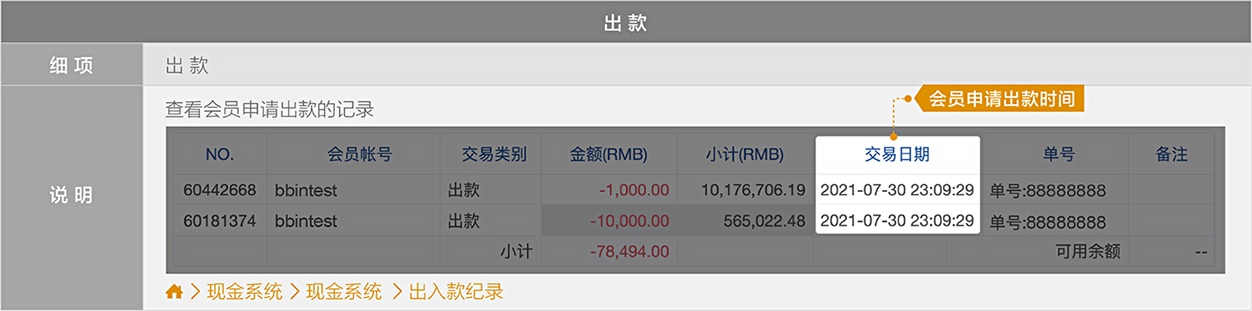 BB现金系统的【单号】栏位 = 往来记录的【备注】栏位(会员端看不到BB现金系统的备注栏位)