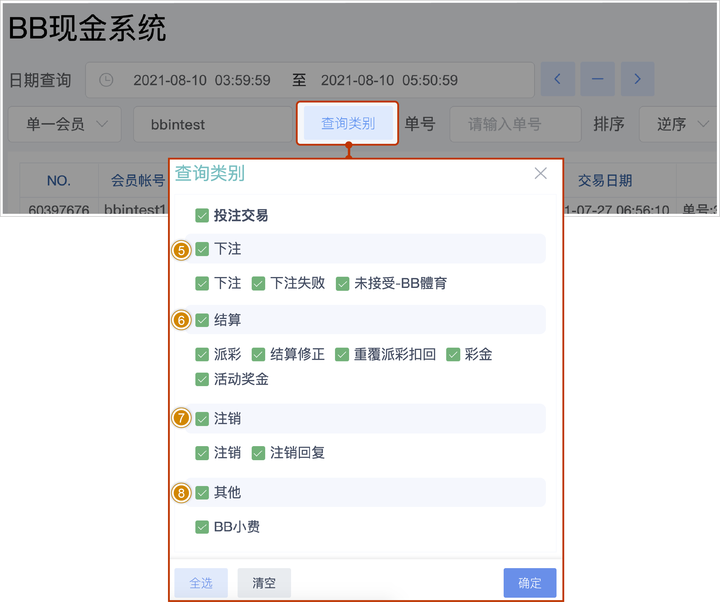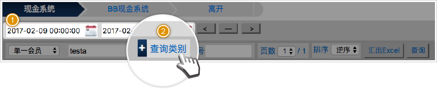针对【全部会员】查询时 仅可查看「入款.出款交易」「投注交易」
