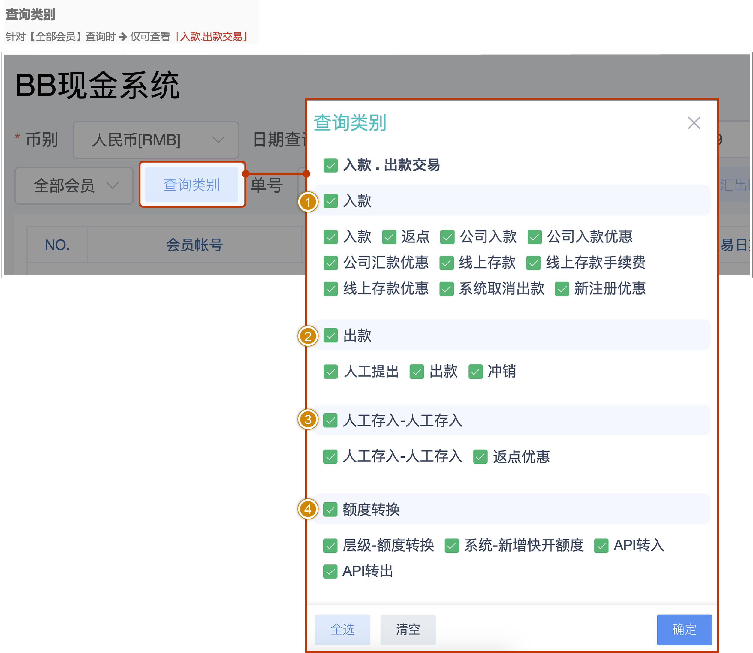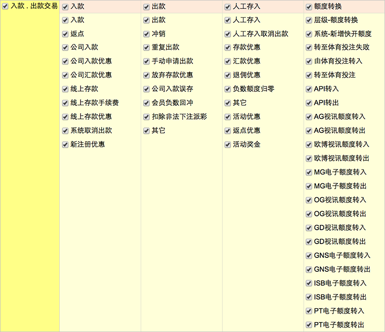 针对【全部会员】查询时 仅可查看「入款.出款交易」