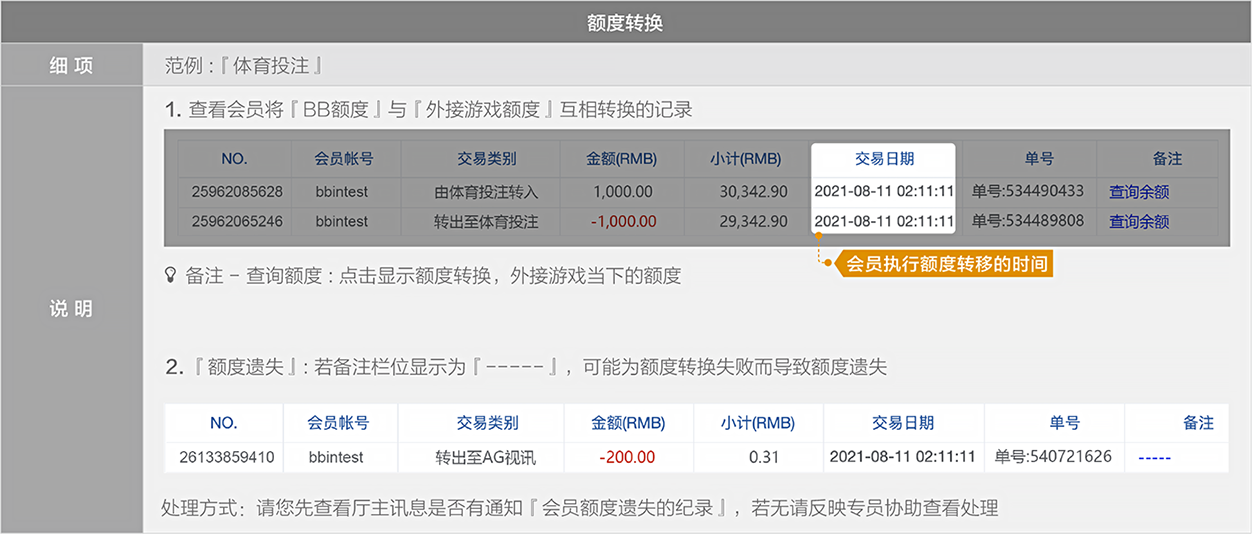 处理方式 : 请您先查看厅主讯息是否有通知『会员额度遗失的纪录』,若无纪录,请反映专员协助查看处理